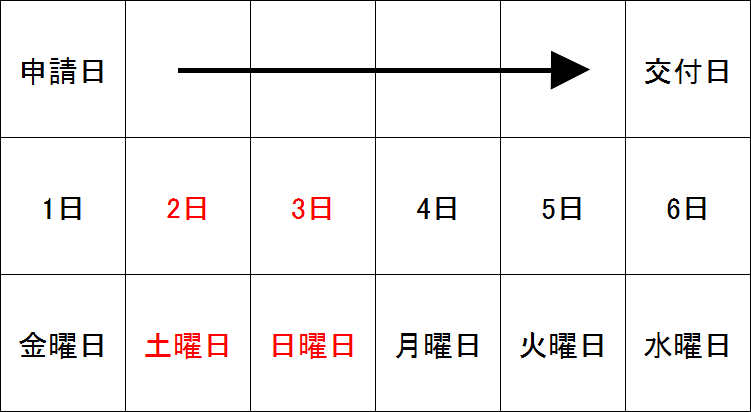 あいだに土日や祝日がある場合、その日は数えません。金曜日に申請をしたら水曜日に交付されます。